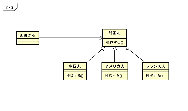 例えば、「山田さん」クラス、「外国人」クラスを用意し、「外国人」クラスには「挨拶する」というメソッドを定義します。さらに、「外国人」クラスのサブクラスに「中国人」クラス、「アメリカ人」クラス、「フランス人」クラスを作ります。