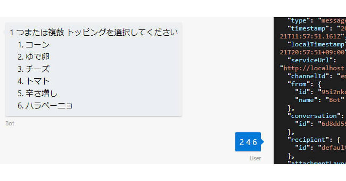何か文字を入力すると、メッセージとともに、選択肢がボタンとして表示されます。「ビーフ」を選択すると確認メッセージが表示されます。