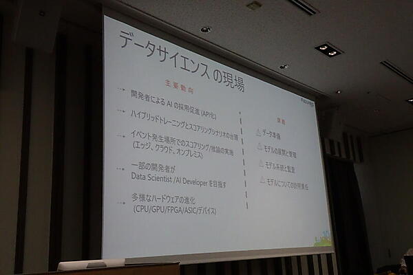 ここで畠山氏は、データサイエンスの現場の動向として、データサイエンティストのほかに開発者がAIに取り組み一部はデータサイエンティストを目指していることなどを挙げた。また課題として、データの準備が8〜9割の工数をとること、モデルの管理、モデルについての責任などを挙げた。