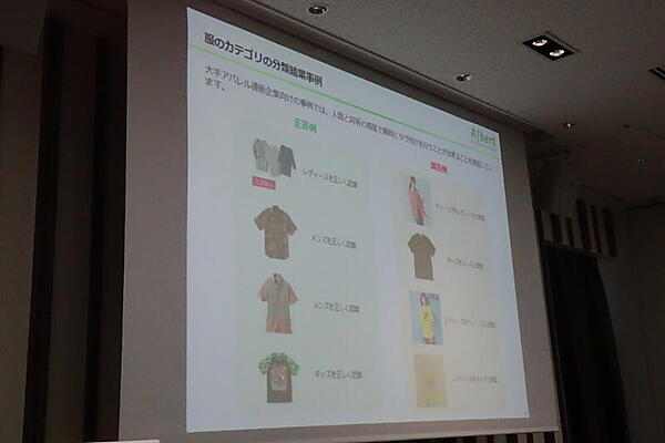 上村崇氏は、2015年に開始した画像分類サービスの事例を紹介した。大手アパレル通販企業の事例では、商品写真からメンズ、レディース、キッズなどに自動でタグづけた。