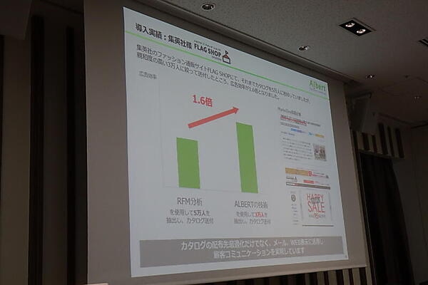 自社ブランドでのプロダクトやサービスとしては、まず自動ターゲティングサービス「Gripper」が紹介された。顧客が過去に買ったり見たりした商品だけでなく、製品の見た目や特徴を学習してターゲティングするものだ。事例としては、アパレル通販の「FLAG SHOP」では、カタログ送付先を親和度の高い人に絞ることで広告効果が1.6倍になったという。