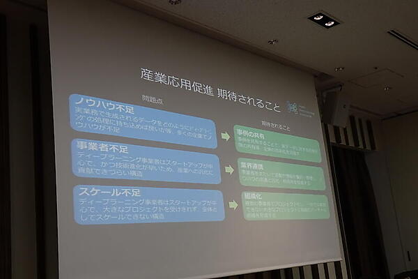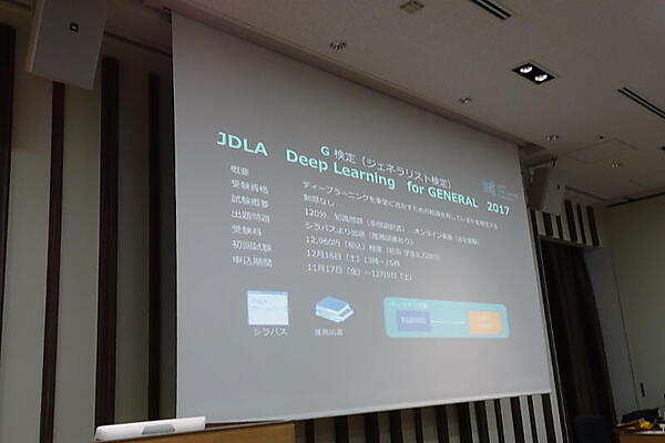 一般社団法人日本ディープラーニング協会(JDLA)の岡田隆太朗氏は、10月4日に設立が発表された同団体について紹介した。設立目的は「ディープラーニングによる日本の産業力向上」で、理事は東京大学の松尾豊氏。