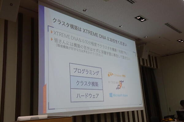 奥野氏は、マルチノードでの並列処理の難しさとしてハードウェア、クラスタ構築、プログラミングの各レイヤーの難しさを語った。そして分散深層学習においては、プログラミングをChainerMNが、ハードウェアをMicrosoft AzureのGPUインスタンスが簡単にするとして、「クラスタ構築はXTREME DNAにお任せください」と語った。