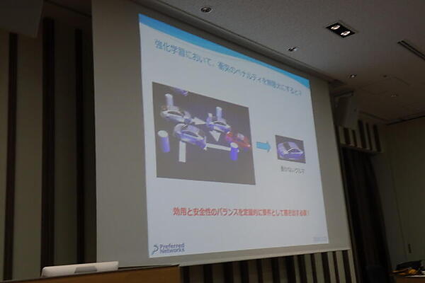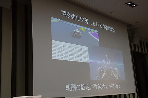 また、深層強化学習だけでレースゲームをクリアできるかという実験をもとに、報酬の設計が性能のカギを握ると語り、「ネズミに芸を仕込むのとあまり変わらない」と述べた。