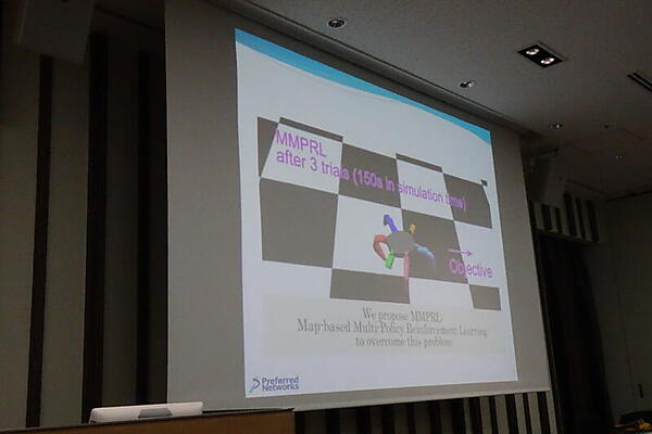 この強化学習を使ったPFNの研究として、6本脚の仮想的なロボットを機械学習で歩くようにしたあと、2本脚を切り取って、再び歩くようにさせるものも紹介された。