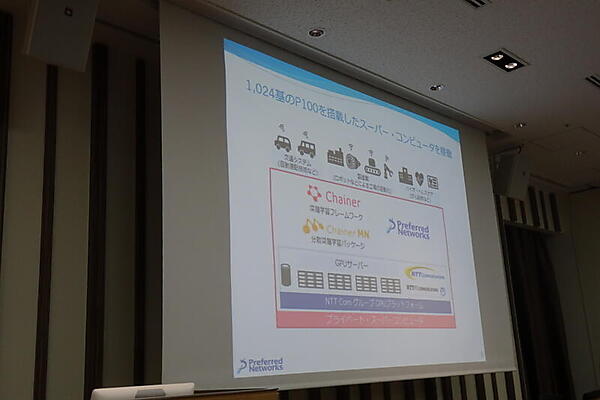 続いて、PFNが、NTTコミュニケーションズのGPUプラットフォーム上にプライベートスーパーコンピュータを構築したことが紹介された。NVIDIA Tesla P100 GPUを1024基搭載しその上でChainerMNを動かすという。