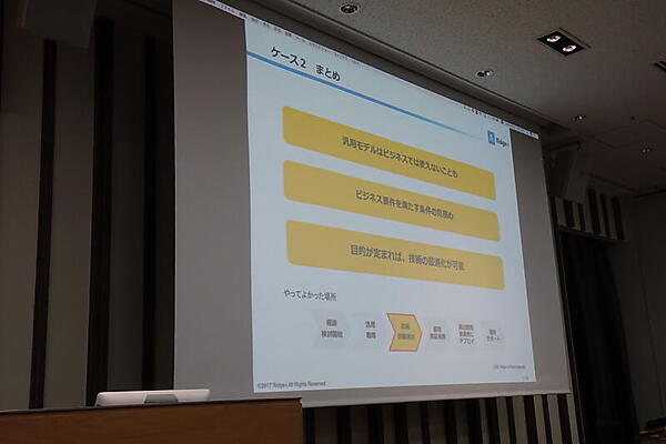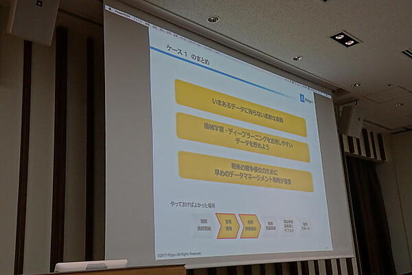 ケース1は「ビッグデータあるある」。データが不整形、写真の対象物体アングルが揃っていない、対象物体以外にいろいろ映りすぎといった、教師データを用意するだけで大変という例だ。これについては、いまあるデータにこだわらない姿勢や、機械学習を活用しやすいデータを貯めること、早めのデータマネージメント戦略が必要なこととして説明された。