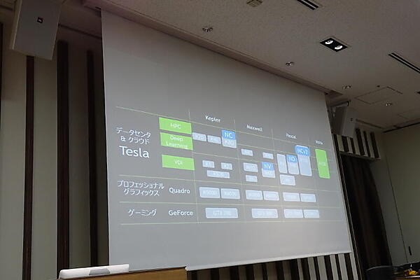 まず製品ラインを整理した。ゲーミング向けの「GeForce」、ワークステーション向けの「Quadro」、データセンタ&クラウド向けの「Tesla」に分け、TeslaをさらにVDI用、ディープラーニング用、HPC用に分けた。そして、これらをKepler世代、Maxwell世代、Pascal世代、Volta世代に分けた。