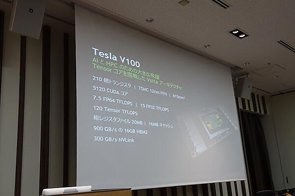 続いて、Volta世代のTesla V100を佐々木氏は解説した。氏はV100を「マイナーバージョンアップ」ではないとして、6倍違うという理論ピーク性能などを語った。