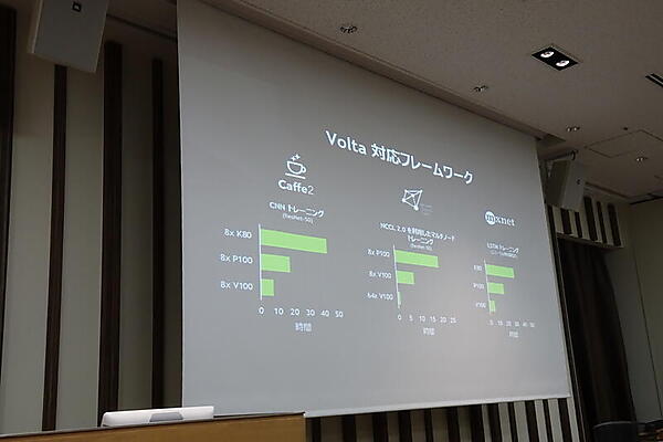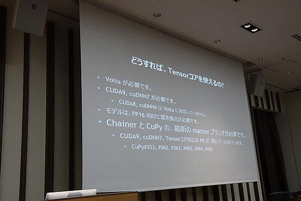 ただし、ディープラーニングでTensorコアを使うには、Tensorコアに対応したソフトが必要なことを説明。そのために、NVIDIAでCaffe2、CNTK、MXNetにコントリビュートしたと紹介した。Chainerについては、NVIDIAとPFNで作業中で、最新のmasterブランチの開発版にはだいぶマージされている、と佐々木氏は語った。