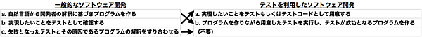 一方、開発においてテストを利用する方法があります。はじめに実現したいことをテストもしくはテストコードとして用意し、その後プログラムを作りながら用意したテストを実行し、テストが成功するプログラムを作ります。このように開発においてテストを利用することで、解釈にずれを発生させず、プログラムの完成を容易かつ明確に判断できるため、開発を加速させていくことが可能になります。両者を比較すると、違いは図2のようになります。