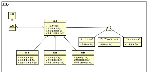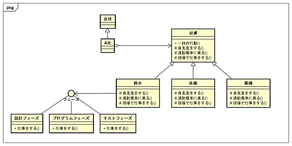public class 鈴木 extends 社員 { private String フェーズ; public 鈴木(String フェーズ) { this.フェーズ = フェーズ; } @Override protected void 身支度をする() { // 洗面所で顔を洗う } @Override protected void 通勤電車に乗る() { // 京急線を使う } @Override protected void 現場で仕事をする() { if (フェーズ.equals("設計")) { // 設計書を作る } else if (フェーズ.equals("プログラム")) { // プログラムを作る } else if (フェーズ.equals("テスト")) { // テスト計画書を作る } } }これでも要件を満たして動作しますが、if文を使うとフェーズの条件が増えた場合に、if文の分岐も増やさないといけません。 プログラムに手を入れるということは、そのクラスを再テストしなくてはいけなくなるため、非常に効率が悪いです。効率が悪いだけならまだしも、正しく動いているものを修正することでバグを生み出してしまうなど、if文の分岐は数が多いと可読性が低下します。 そこで、第2回で解説したJavaのようなオブジェクト指向言語の最大の特徴とも言える「ポリモーフィズム」を使わない手はありません。 追加された例題をもう一度よく読んでみます。「鈴木さんはフェーズによって仕事の内容が変わります。設計フェーズでは……」となっています。冒頭で幾つかよく使用されるデザインパターンを挙げましたが、このケースではその中で状態によって振る舞いが変わる場合はStateパターンが適用できそうです。 Stateパターンとは、文字通りモノについての「状態」をクラスで表現します。状態によって振る舞い(処理)が異なることがあります。例えば、挨拶は時間帯によって変わります。朝であれば「おはよう」ですが、昼は「こんにちは」になり、夜は「こんばんは」になります。 挨拶は「おはよう」で固定されているわけではなく、状態(この場合は時間帯が状態といえます)によって振る舞いが異なります。このような場合にStateパターンを適用すると個々のクラスで状態を表現するため、分岐が消えてシンプルな作りになります。 ちなみに、状態によって振る舞いが変わる場合はStateパターンですが、この「状態によって振る舞いが変わる」が例題の「フェーズによって仕事の内容が変わる」に当てはまり、Stateパターンの「状態」が例題の「フェーズ」に当てはまるわけです。 それでは試してみましょう。例題ではフェーズの状態によって仕事の内容が変わるので、仕事内容の変化はif文ではなく「フェーズ」というインターフェースを用意します。フェーズインターフェースには「仕事をする」宣言を定義し、交換可能な作りにします。public interface フェーズ { void 仕事をする(); }フェーズインターフェースを実装したクラスは、状態(フェーズ)ごとの具体的な振る舞い(仕事内容)を記述します。public class 設計フェーズ implements フェーズ { @Override public void 仕事をする() { // 設計書を作る } } public class プログラムフェーズ implements フェーズ { @Override public void 仕事をする() { // プログラムを作る } } public class テストフェーズ implements フェーズ { @Override public void 仕事をする() { // テスト計画書を作る } }鈴木クラスの「現場で仕事をする」メソッドは、次のようになります。public class 鈴木 extends 社員 { private フェーズ フェーズ; public 鈴木(フェーズ フェーズ) { this.フェーズ = フェーズ; } @Override protected void 身支度をする() { // 洗面所で顔を洗う } @Override protected void 通勤電車に乗る() { // 京急線を使う } @Override protected void 現場で仕事をする() { フェーズ.仕事をする(); } }仕事内容の変化はif文ではなく、受け取ったインスタンスによって異なる振る舞いをする、まさにポリモーフィズムで変えています。クラス図で表すと下図のようになります。鈴木クラスからフェーズインターフェースには菱形のない実線だけで線を引いていますが、前回解説した包含は菱形の付いている実線で表します。包含は集約とも言い、「全体と部分」の意味を持つ場合に用いため、今回の「鈴木」と「フェーズ」は関係があるという意味の「関連」にします。関連は実線だけで表します。 ちなみに、継承、集約、関連以外に「依存」というものもあります。依存は関連よりもクラス間の依存度が低く、協調の長さが短い場合に用います。 プログラムで言うとインスタンス変数ではなく、メソッド内で定義するローカル変数で対象のクラスを表します。依存はクラス間の点線で表します。 一度、ここまでで期待通りに動作するかテストクラスを作って確認してみましょう。その前に、日本語で書いたクラスを論理モデルから物理モデルに進めて英語に直します。/** * 会社 */ public class Company { } import java.util.List; /** * A社 */ public class CompanyA extends Company { private List employees; public CompanyA(List employees) { this.employees = employees; } public void instruct() { employees.forEach(employee -> employee.actOneDay()); } } /** * 社員 */ public abstract class Employee { public void actOneDay() { attireOneself(); getToWork(); doTheWork(); } // 身支度をする protected abstract void attireOneself(); // 通勤電車に