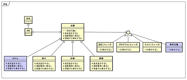 したがって、クラス図は最初に挙げた鈴木クラスからフェーズインターフェースに関連を持ったクラス図ではなく、どの社員も仕事内容が切り替わるように、社員クラスからフェーズインターフェースに関連を持つ以下のクラス図の方が優れた設計と言えます。