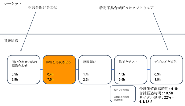 筆者はまず関係者と現状や課題に対する認識合わせから始めることが多く、そのためにValue Stream Mappingをよく使っています。Value Stream Mappingでは「マーケット(自分が価値を提供している相手)から要求がきて、それを解決するまでの流れ」で起きていること(ステップ)を見えるようにし、各ステップでのリードタイム(経過時間)と価値創造の時間(最終成果物をつくっている時間)を実績から割り当てます(図2)。