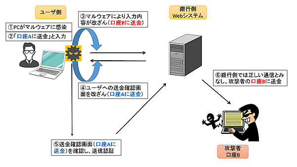 Man-in-the-Browser(MITB)攻撃は、マルウェアの動作によりブラウザとWebサーバー間の通信を盗聴・改ざんする攻撃です。例えば、銀行系のサイトへのログイン時に、そのログインセッションを乗っ取り攻撃者の口座に送金させます。この時ユーザ側の画面は改ざんされており、ユーザはその不正に気付くことができません(図1)。
