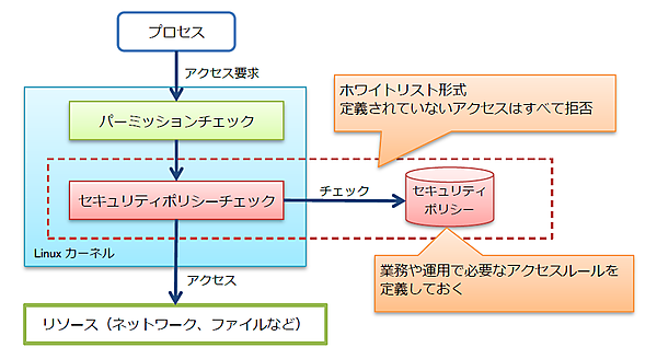 強制アクセス制御は、「誰が何にどのようにアクセスできるか」というセキュリティポリシーに従ったアクセス制御を強制します。このアクセス制御はホワイトリスト形式となっており、あらかじめ定義したアクセスルール以外のアクセスについてはすべて拒否します。