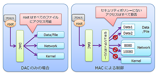 例えば、あるプログラムが脆弱性を突かれ、プロセスを乗っ取られてroot権限に昇格された場合、従来からある任意アクセス制御(DAC:Discretionary Access Control)ではroot特権によりすべてのファイルにアクセスが可能で、システム全体に影響が及んでしまいます。対してSELinuxが有効なシステムでは、強制アクセス制御(MAC)によりそのプロセスがアクセスできる範囲を限定します。結果、破壊活動を行おうとしてもアクセス拒否が発生し、動きを封じ込めることができます。