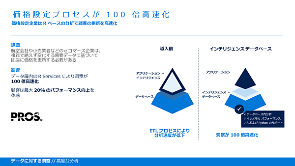ここでSQL Server 2017のR対応の事例として、航空チケットのPROS社が紹介された。Rによるインサイトをアプリケーション側ではなくデータベース側に組み込むことにより、10倍の速さを実現し、カスタマーサービス向上とアジリティにつなげたという。