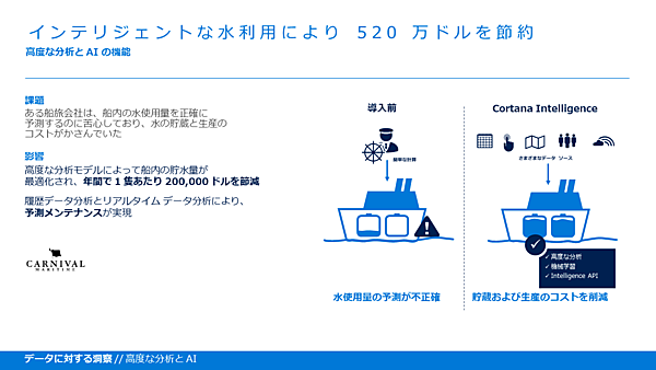 事例としてはクルーズ船のCarnival社が、船内の飲み水の消費量を正確に予測するためにAzureのCortana Intelligenceサービスを使い、年間で1隻あたり20万ドルのコストを削減したことが紹介された。