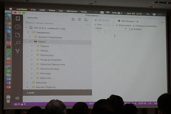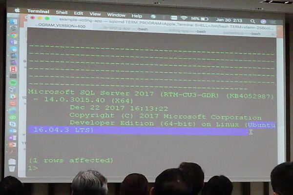 ここでTravis氏は、SQL Server 2017 on Linuxをデモした。まず、MacBookのDocker for MacにSQL Serverの入ったUbuntuイメージを取得してある状態で、一瞬でSQL Server 2017 on Linux環境が起動。sqlcmdコマンドでデータベースやテーブルを作成し、データを追加してみせた。また、GUIツールのSQL Operations Studioも披露した。
