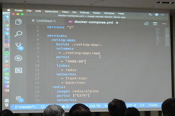 次のデモは、Docker Composeにより、SQL Serverを含む5つのコンテナーからなるWebアプリケーションを動かす例。犬派・猫派を投票するWebアプリケーションを実演した。