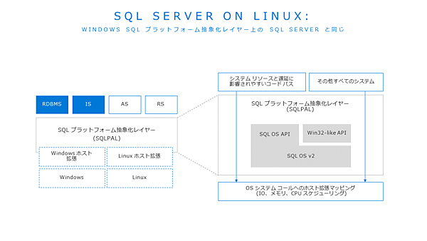 SQL Server 2017の特徴として、Travis氏はまずLinux対応に力を入れたことを挙げた。その技術的な背景としては、SQL Server 2015で、OSの機能をSQL Serverの中に入れた「SQL OS」を採用したことを紹介し、それ以来Windowsへの依存度が減ったと語った。また、コンテナ技術の研究プロジェクトであるProject Drawbridgeにより、Win32APIを約50のカーネルABIにマッピングできることがわかったと説明した。これらの技術が元になって生まれたプラットフォーム抽象化が「SQLPAL」で、これによりSQL ServerがLinuxでも動くようになったという。