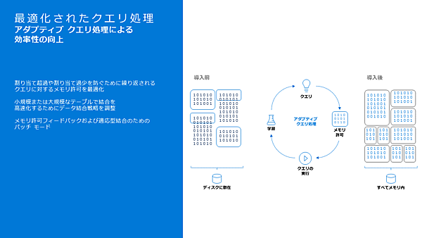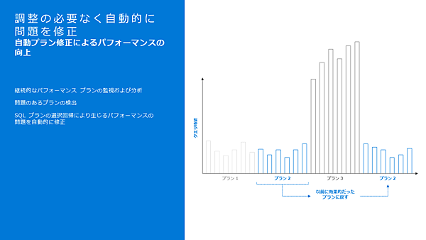 続いて紹介された新しい機能は「アダプティブクエリ」と「自動プラン修正」だ。機械学習によりメモリーの使い方などを最適化してクエリのパフォーマンスを向上させる機能と、実行計画を変更してパフォーマンスが低下した場合に前に戻す機能だ。