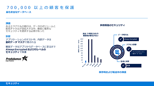 SQL Serverの事例としては、まずエクアドルのProdubanco銀行の例が紹介された。多層セキュリティのためにSQL Serverでデータをマスキングする「Always Encrypted」機能を採用した。データを行レベルで暗号化して保存し、暗号化したままクエリできる。