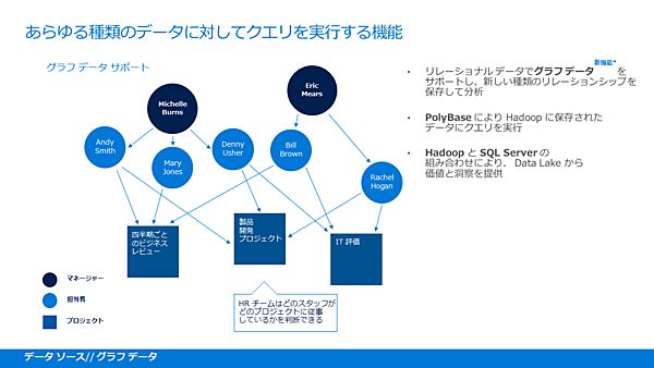 続く新機能としては、グラフデータベース機能をTravis氏は紹介した。専用グラフデータベースではなくSQL Serverで、T-SQLからクエリすることにより、さまざまなSQL Serverの機能が活かせるという。