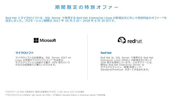 こうしたSQL Server 2017 on Linuxへの移行のためのキャンペーンとして、Red Hatとの共同による新規注文に対する期間限定の特別料金を紹介した。MicrosoftではSQL Server 2017 on Linuxのサブスクリプションを初年度最大30%割引。Red HatはSQL Server 2017 on Linuxで使用するRed Hat Enterprise Linux(RHEL)を30%割引する。期間は2017年10月2日〜2018年6月30日。