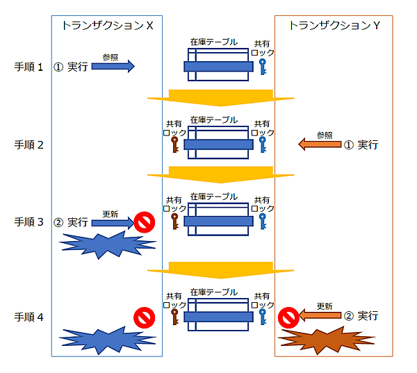 →トランザクションYが在庫テーブルの該当行に共有ロックを掛ける - 手順3:トランザクションXにおいて②を実行する