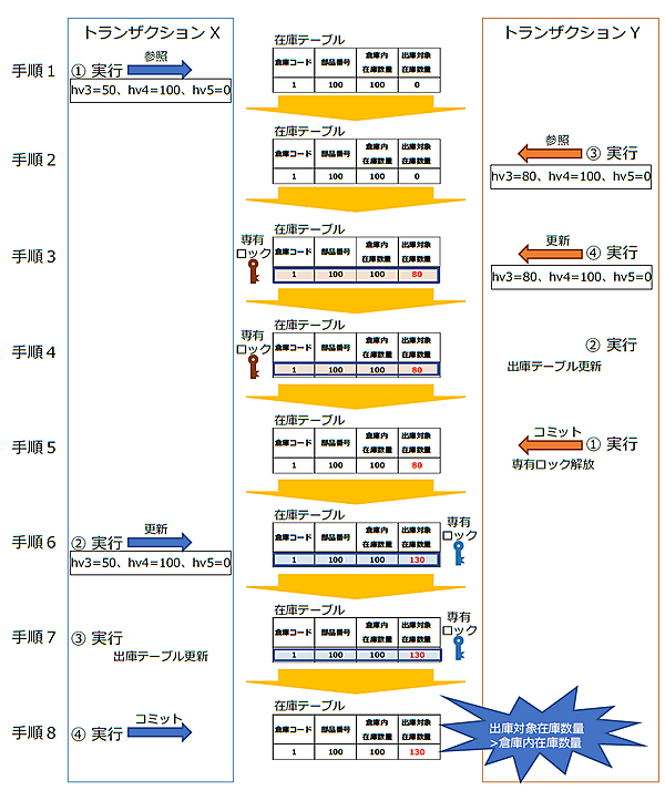 ところが、あるトランザクションが①を実行したあと、②を実行するまでの間に他のトランザクションが②~④を全て実行して①が検索した部品の出庫対象在庫数量が増え、あるトランザクションが②を実行するときには出庫数量が引当可能な在庫数量を超えてしまい、「出庫対象在庫数量が倉庫内在庫数量在庫数を超える状態」が生じてしまいます。これは在庫数量が不正な状態を意味しています。具体例として、倉庫コード=1、部品番号=100、倉庫内在庫数量=100、出庫対象在庫数量=0の在庫テーブルに対して、トランザクションXとYを以下の手順で処理を実行した場合を考えます。