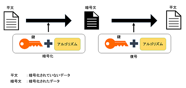 暗号化を行うためには、アルゴリズムと鍵が必要です。アルゴリズムは平文をどのように暗号化するかを定めたもので、AESやRSAなど一般に公開されている技術を用います。鍵は暗号化や復号の際に用いる秘密のデータで、非公開で運用します。鍵を非公開にすることで第三者は復号できなくなるため、データを保護できるわけです。