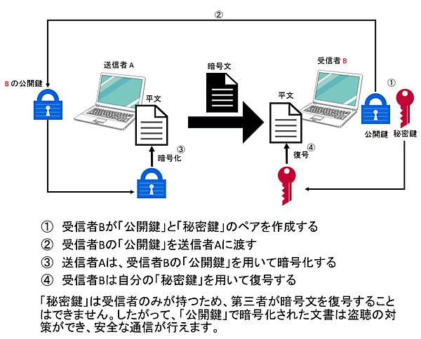 - 一方の鍵で暗号化した情報は、もう一方の鍵でのみ復号できる