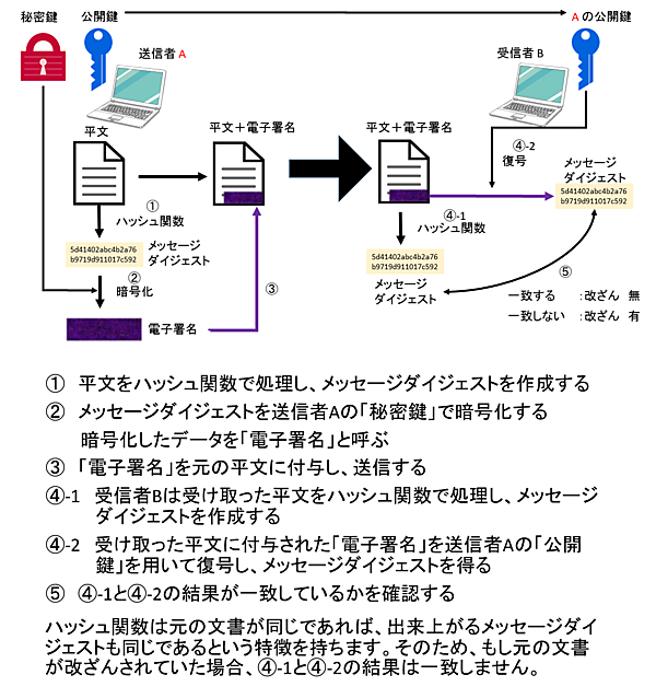 図4の公開鍵暗号方式の認証の仕組みを基に、ディジタル署名の仕組みをまとめてみましょう(図5)。