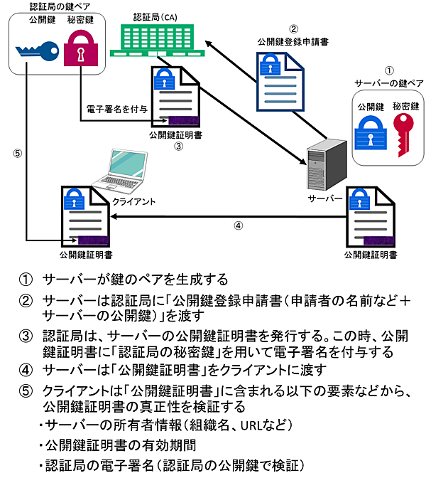 公開鍵証明書には「サーバーの公開鍵」が含まれ、さらに「サーバーの所有者情報(組織名、URLなど)」「証明書の有効期間」「認証局のディジタル署名」などが含まれます。また、クライアントは受け取ったサーバーの公開鍵が本物であることを検証するために、サーバーの所有者情報が正しいか、証明書の有効期間が有効であるか、認証局のディジタル署名が認証局の公開鍵で検証できるかなどを確認します。