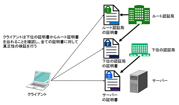 ここで、認証局の公開鍵も信用できるものであると保証する必要があります。認証局は階層構造で構築され、上位の認証局の秘密鍵で下位の認証局の公開鍵証明書の電子署名を生成することで上位の認証局が下位の認証局を保証します。最上位の認証局をルート認証局と呼び、クライアントはルート認証局を信頼する(ブラウザなどに予め登録)ことにより、下位の認証局、ひいてはサーバーまで信頼するモデルが成り立っています(図7)。