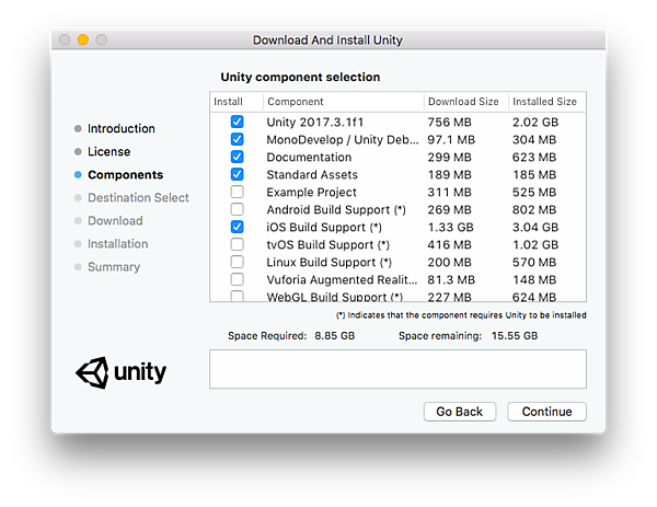 ライセンスに同意すると、次はダウンロードとインストールを行う対象を選択します。「Unity 2017.3」以外にも、今回はコンポーネントとして「MonoDevelop」「Documentation」「Standard Assets」「iOS Build Support」の4つを選択します(図6)。