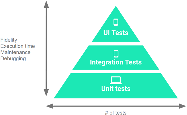 Google I/O 2017における講演「Test-Driven Development on Android with the Android Testing Support Library」での発表以来、GoogleはAndorid開発者向けWebサイトの「Fundamentals of Testing」というページでAndroidアプリの開発フローと、それに対するテストについて解説しています。その中の「Understand the Testing Pyramid」 という段落でテストピラミッドに触れており、ピラミッドを大きくUnit Tests/Integration Tests/UI Testsの3つに区分しています(図1)。
