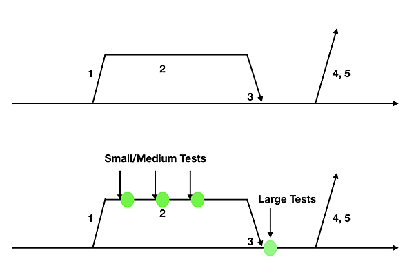 この手順の流れに対して、前述したテストサイズの実行タイミングを考えます。例えば、次の流れで適用するとします。