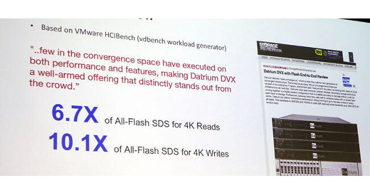 そしてデイトリウムの製品は、そのHCIの欠点を解消するために開発されたというのが今回の発表でデイトリウムが言いたかったことだ。特にHCIにおいてデータが複数のチャンクに分割され、ネットワークを介した他のノードのストレージに書き込まれることによって冗長性を担保している部分について「データの読み書きにオーバーヘッドが加わっている」というのがデイトリウムの説明だ。また必ずイーサネットのインターフェースを通じてデータが通信されることによって「データ量が増えるとネットワーク幅がボトルネックになる」と解説した。