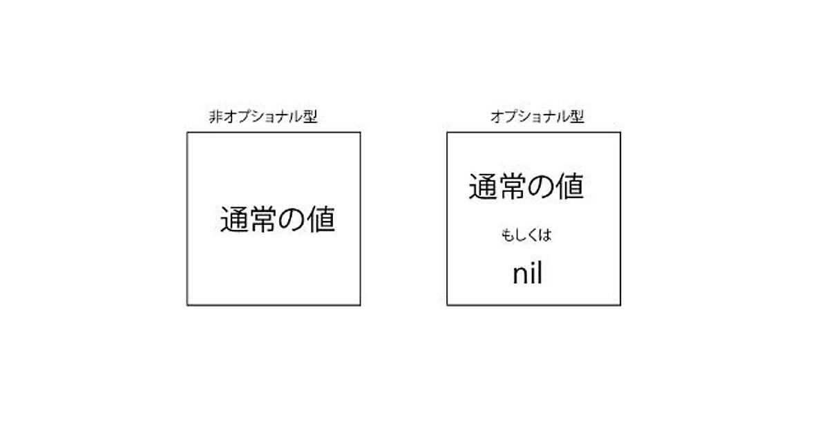 Swiftの変数は、オプショナル型とそれ以外(非オプショナル型)に大別されます。Swiftにはnilという、ある型に値がない状態を表す特別な値がありますが、非オプショナル型の変数に格納できるのは通常の値のみで、nilを格納することはできません。それに対してオプショナル型の変数には、通常の値もしくはnilのどちらかを格納することができます。