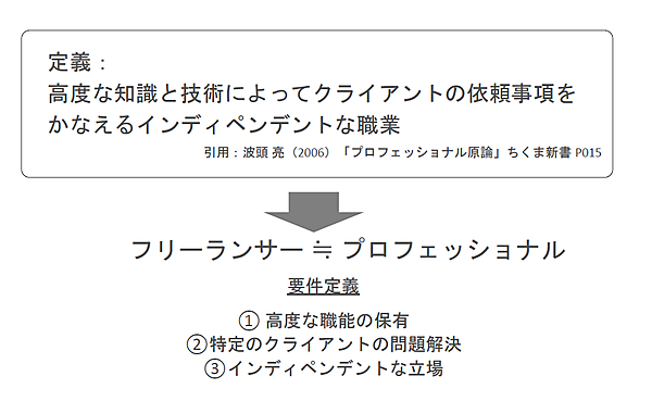 中野さんは独立した時、まずは「フリーランサーってなんだろう?」と定義することからはじめました。フリーランスについて考える中で、波頭 亮氏の「プロフェッショナル原論」(ちくま新書)に出会った中野さん。この本では『プロフェッショナル』が「高度な知識と技術によってクライアントの依頼事項を叶えるインディペンデントな職業」とされ、この定義が中野さんの中で腑に落ちた部分があり、求められるフリーランサー≒プロフェッショナルと考えるようになったそうです。