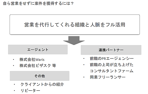 PRとして企業をセールスするのは得意でも、自分をセールスするのは苦手だという中野さん。しかも、対面で営業するとディスカウントされる心配や、苦手な営業に時間を割かれるというデメリットが……。そこで、自分で営業せずに仕事を獲得する方法として「営業を代行してくれる組織と人脈をフル活用するべきだ」と話します。