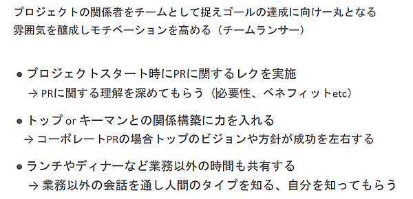 中野さんはチームメンバーを巻き込むため、プロジェクトスタート時にレクチャーを実施して PRに関する理解を深めてもらい、さらにトップやキーマンとの関係構築に力を入れるそうです。また、メンバーとはランチやディナーなど業務以外の時間も共有することで雰囲気を作り、自分を知ってもらう機会を持つことも大事だと言います。