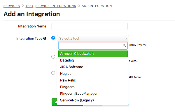 第2回の冒頭でも書きましたが、PagerDuty自体にはサーバやサービスの状態を監視する機能がありません。監視機能はほかのツール、サービスを利用します。具体的には、Serviceの設定項目にあるIntegrationsタブで使用するモニタリングシステムを選択できます。