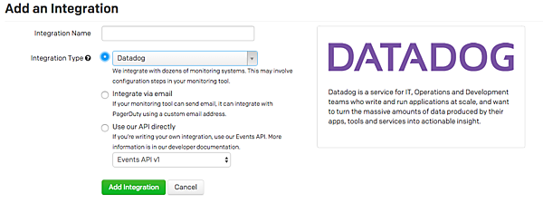 プルダウンから「Datadog」を選んでAdd Integrationボタンをクリックします。この時点で Integration Key というものが払い出されて一覧に表示されていますが、今後の手順に沿って作業すれば自動的に入力されるため、特に気にしなくても問題ありません。基本はこれで終わりなのですが、最初の1回のみ、Datadogが使用するAPI Keyを払い出す必要があります。ConfigurationのAPI Accessから、Create New API Keyをクリックします。