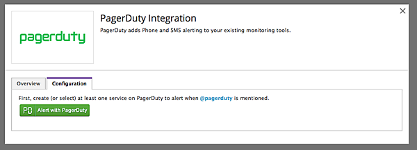 テキストボックスにPagerDutyと入力するとAvailableのボタンが表示されます。マウスオーバーするとInstallボタンになるのでクリックします。ダイアログが表示されるのでConfigurationタブをクリックするとPagerDutyとのインテグレーション確認画面になります。