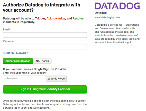 PagerDutyへのログインにメールアドレスとパスワードを使っている場合は上段、シングルサインオンを使っている場合は下段をそれぞれ埋めてボタンをクリックします。次の画面で、PagerDutyのどのサービスを連携させるか選択します。