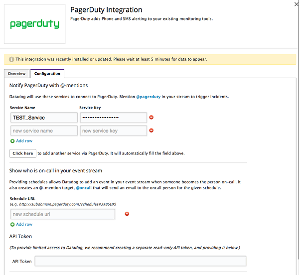 すると自動的に先ほどのIntegration Keyが入力されます。API Token欄に、PagerDutyのAPI Keyをペーストします。これは最初の1回のみ行なえばよく、Serviceを追加する際には不要です。